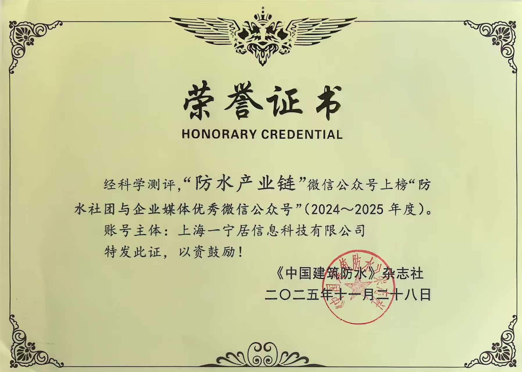 上海一寧居信息科技有限公司旗下核心新媒體平臺——“防水產業鏈”公眾號,憑借專業深耕的內容創作、廣泛的行業影響力及對產業鏈發展的深度洞察,成功獲評《2024-2025 防水社團與企業媒體優秀公眾號》稱號。作為聚焦防水產業的垂直新媒體標桿,“防水產業鏈”公眾號始終以“防水產業數智賦能,資源共享”為核心,長期深耕行業資訊傳播、前沿成果分享與產業鏈資源整合,為防水行業上下游從業者提供及時、全面、專業的信息服務,已成為連接產業各方、推動數智化傳播的重要載體。此次獲評優秀公眾號,是行業對平臺內容專業性、傳播價值與資源整合能力的高度肯定。